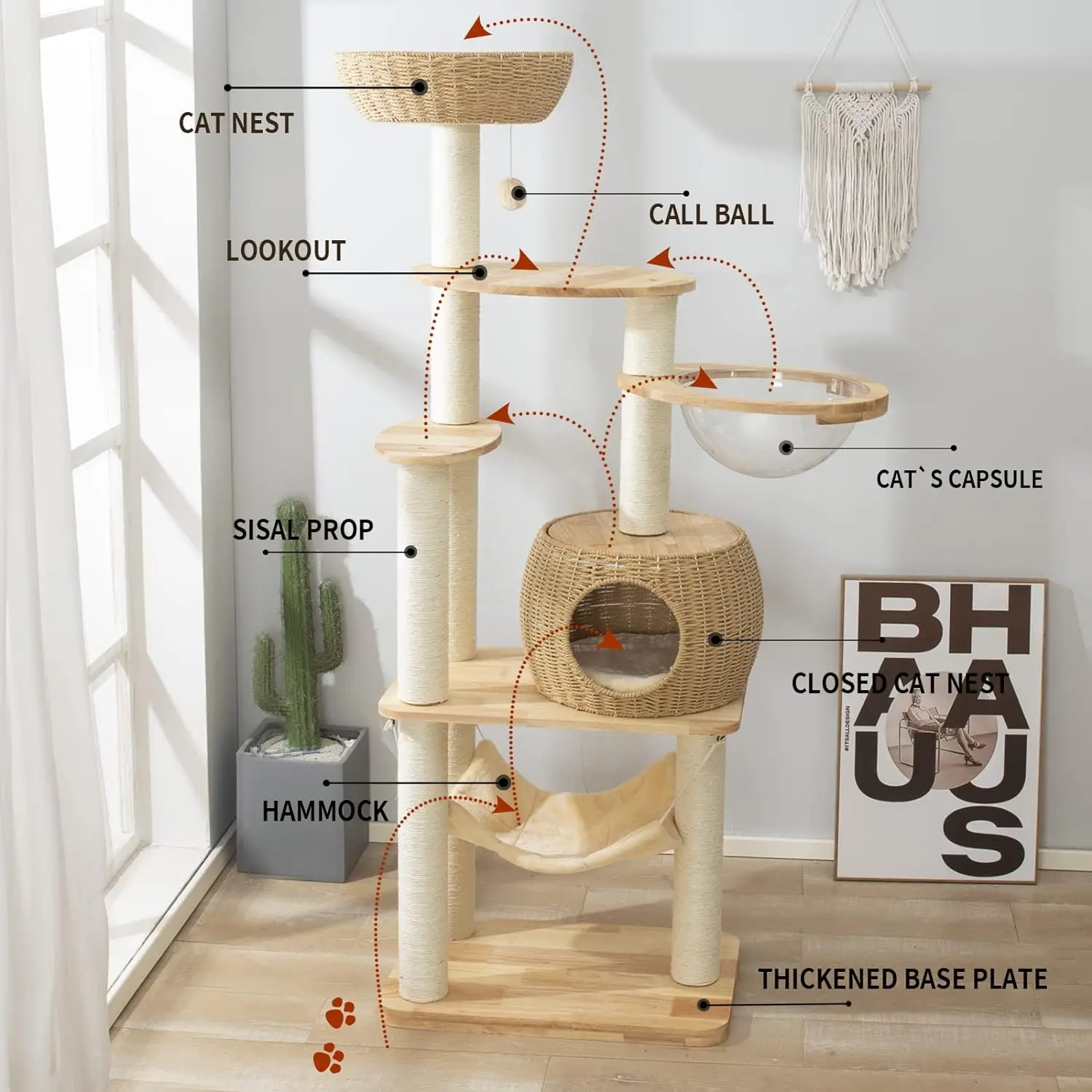 😻【Natural Materials】This wood cat tree is made of Oak, Kraft Paper Pillar, 8 cm Natural Sisal Rope, Handwork Ma Teng Cat's Nest with crafted workmanship, Ensuring long service life. Each scratching post is covered by natural sisal ropes that cats can scratch to protect your delicate furniture. In addition, The upper Space Capsule offers a birds-view for cute climbers.